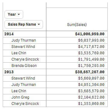 In der folgenden Pivottabelle wurde eine Begrenzung auf die (innere) Dimension Sales Rep Name angewendet, sodass nur die fünf besten Vertriebsmitarbeiter für die Jahre 2013 und 2014 angezeigt werden.