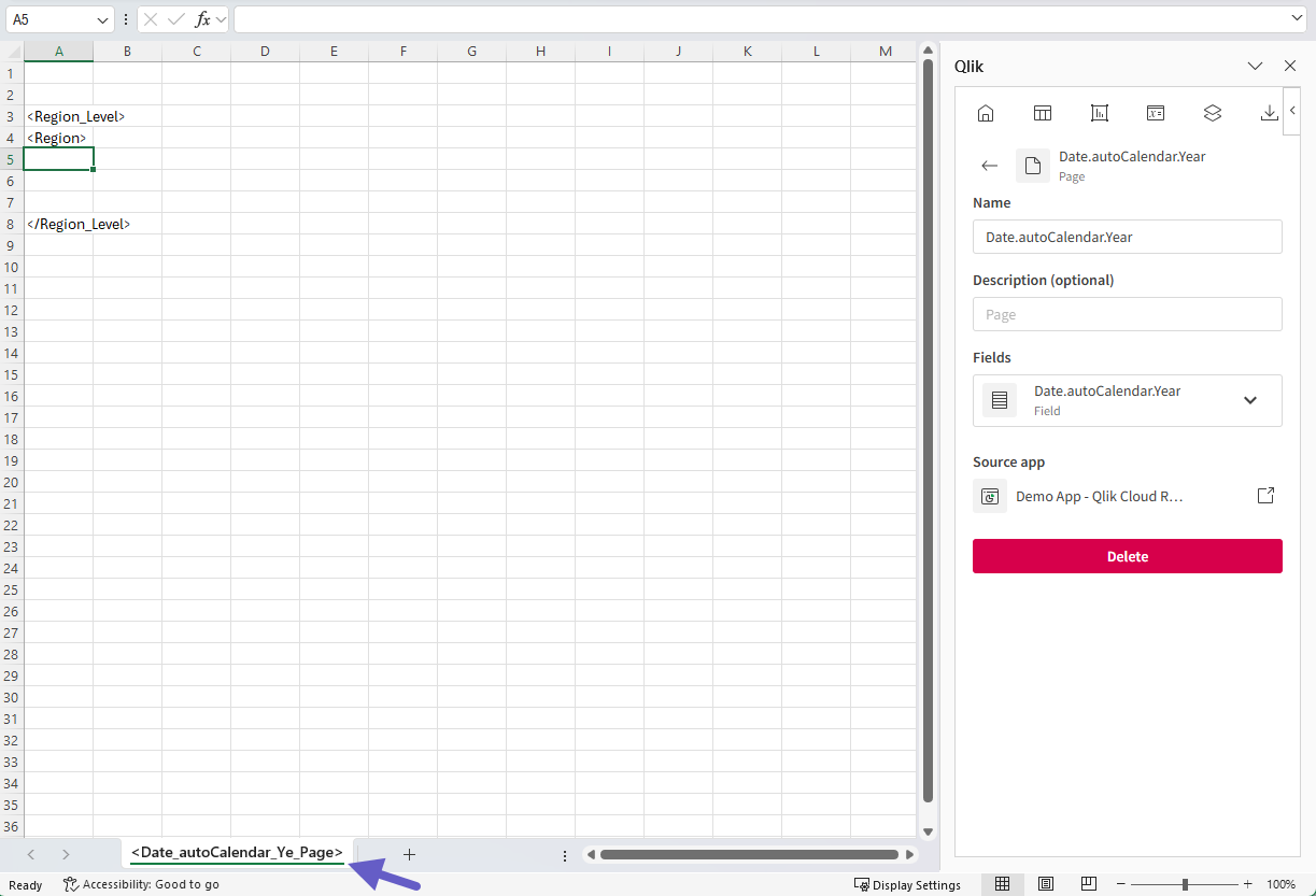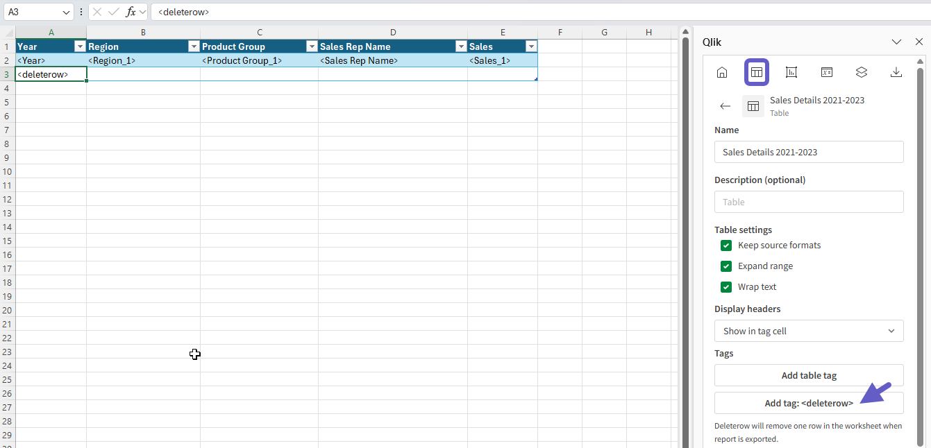 Select cell A3 in the Excel table. In the add-in window, under Tags, click Add tag: <deleterow>.