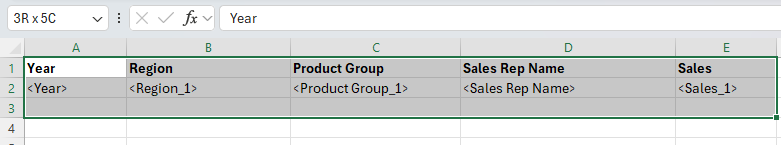 In the worksheet, merge and center two groups of cells in row 1, with the right group being the one that contains the variable.