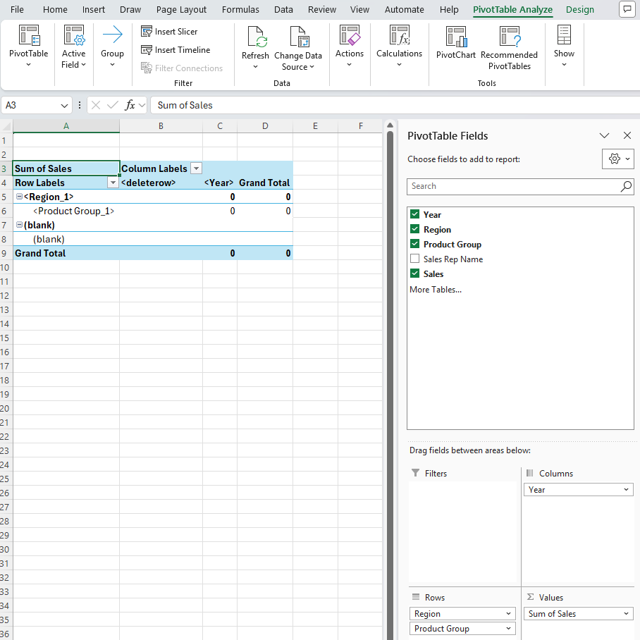 In this example, you will build an Excel-based report to analyze sales by product, year, and region.