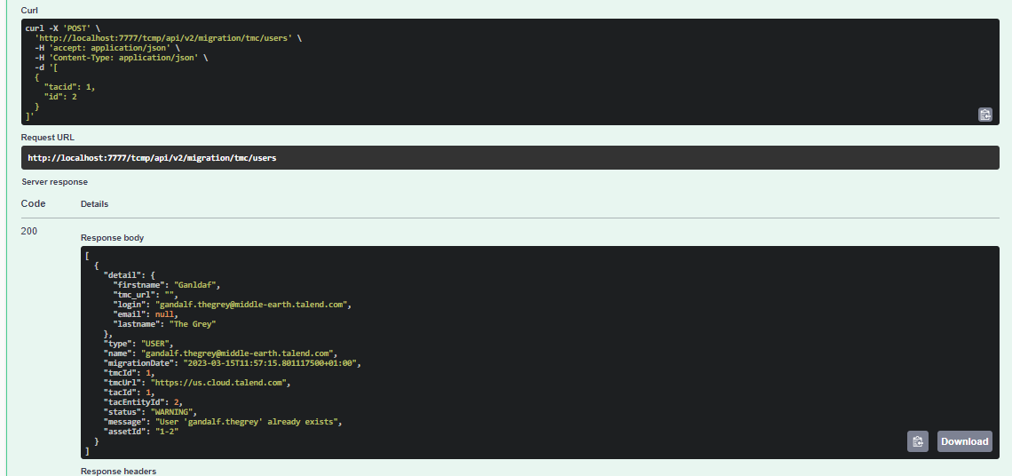 In this scenario, you use Talend APIs to migrate a user from Talend Administration Center to Talend Management Console.
