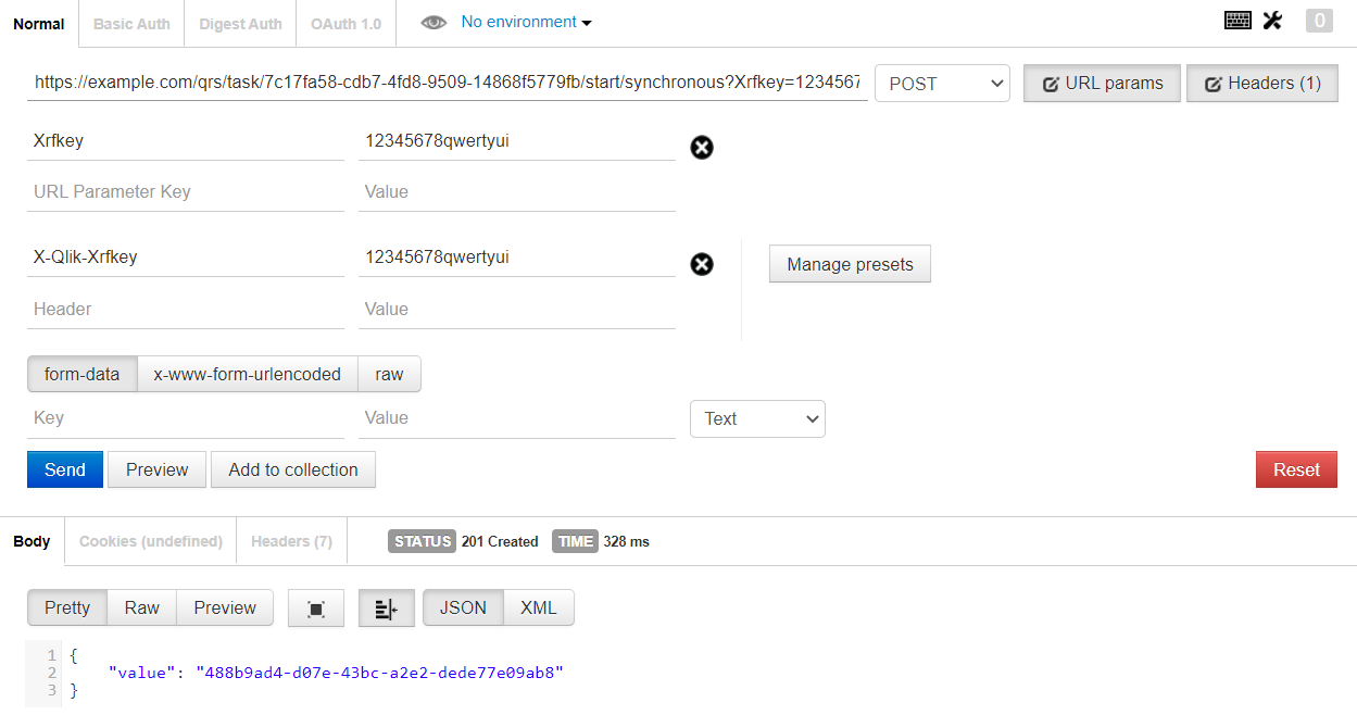 Start a task (for example, a reload task), identified by {id}, so that it runs on a Qlik Sense Scheduler Service (QSS). The call returns an executionsession ID when the task has successfully started. If the call returns an empty GUID ( 00000000-0000-0000-0000-000000000000 ), the task did not start, for example, it is disabled or there is no scheduler to perform the reload or the app is not available.