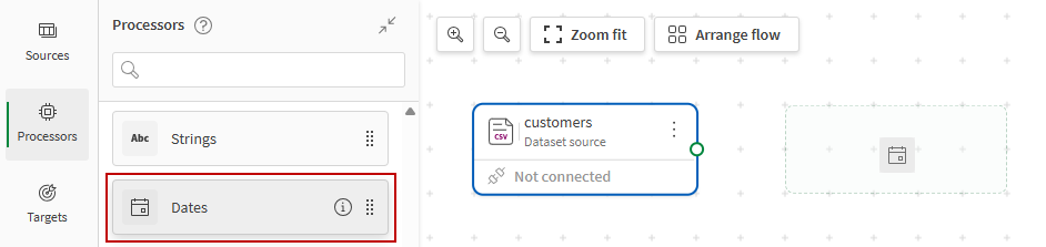 From the Processors tab of the left panel, drag the processor of your choice and drop it on the canvas next to your source.