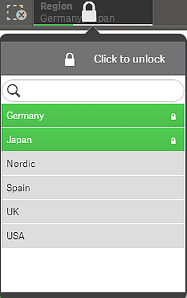 You can lock a selection by clicking in the selection popup. The lock prevents any changes from being made to that selection. You can neither change nor clear a locked selection. If you have locked a selection and then try to select excluded field values, the selection item will flash to indicate that the locked selection prevents the selection from being made.
