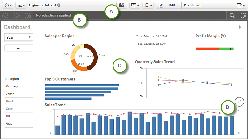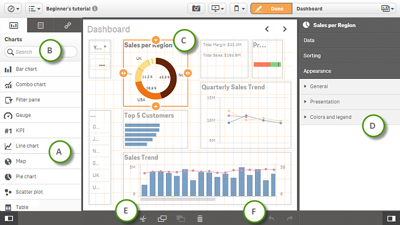| D | Properties of the selected visualization or the sheet. The properties for the sheet is shown if you have not selected a visualization. | |