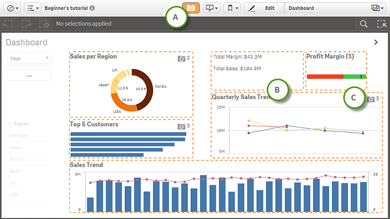 You start analyzing data on a sheet by making selections in the visualizations. You can quickly see and move around among the sheets with the sheet navigator.