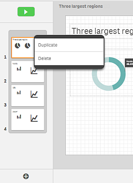 You move between the slides by clicking the thumbnails. A selected thumbnail displays its corresponding slide in the slide view. You can reorder slides by moving them around on the timeline. You can add slides and you can delete slides.
