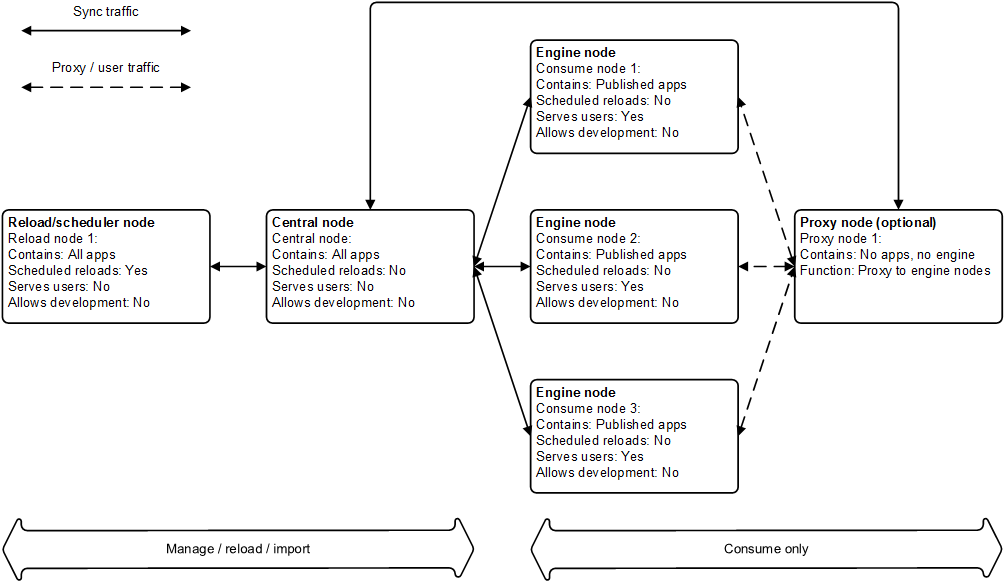 The table below lists the Qlik Sense services that are deployed on each node in the site.