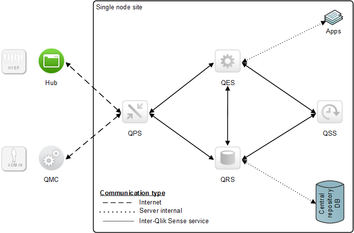 In this deployment scenario, all Qlik Sense services run on a single node. This kind of deployment works best in a single time zone, where reloads of data can be done during the night.