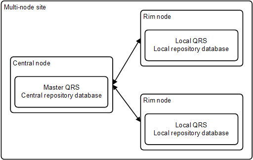 Within a multi-node site, one instance of the Qlik Sense Repository Service (QRS) runs on each node. The QRS running on the central node is considered to be the master. The master QRS has direct access to the central repository database, whereas the other QRSs only have access to a local repository database on the node where they are running. The master QRS synchronizes the central repository database and the local repository databases.