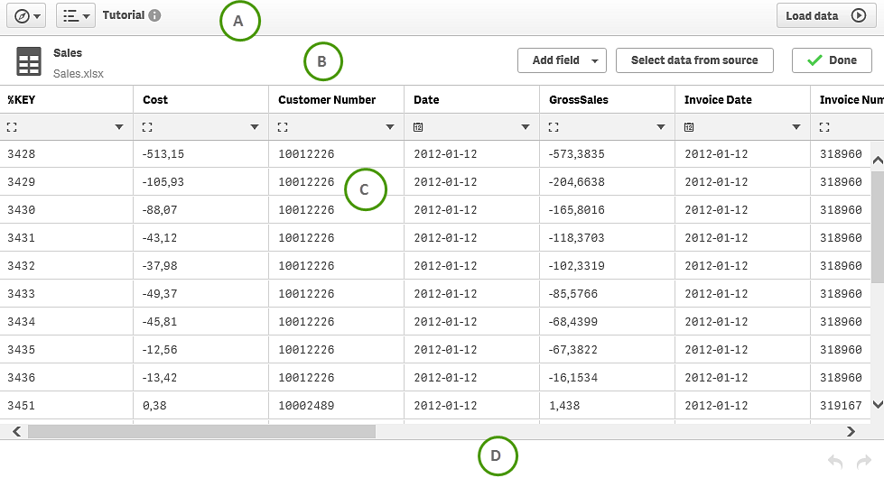 | B | All data tables in the app. You can add data from new or existing data sources, including Qlik DataMarket. You can also edit or remove existing data tables that were added with Data manager. | Adding data from files and databases | ||||||||
