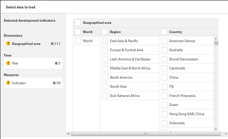 A selection from either World, Region, or Country is valid by itself. Any selection that includes the highest level loads all the data for the regions and countries even if specific regions and countries are also selected. But if a region is selected by itself, then only that region of the world is loaded.