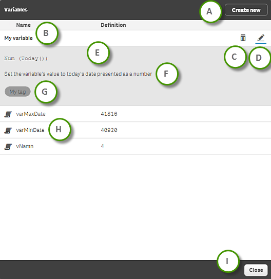 You open the Variables overview by clicking Ò in the edit bar when editing a sheet.