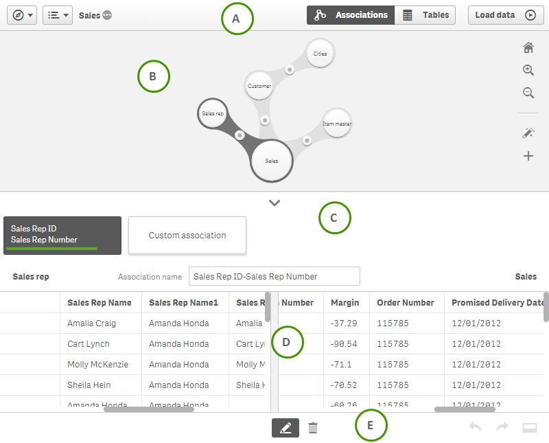 | B | All data tables in the app. You can add data from new or existing data sources, including Qlik DataMarket. You can also edit or remove existing data tables that were added with Data manager. | Adding data to the app | ||||||||||
