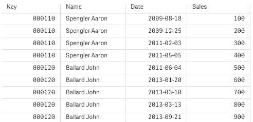 The intervalmatch statement preceded by the inner join replaces the key above with a synthetic key that connects to the Transact table resulting in the following table: