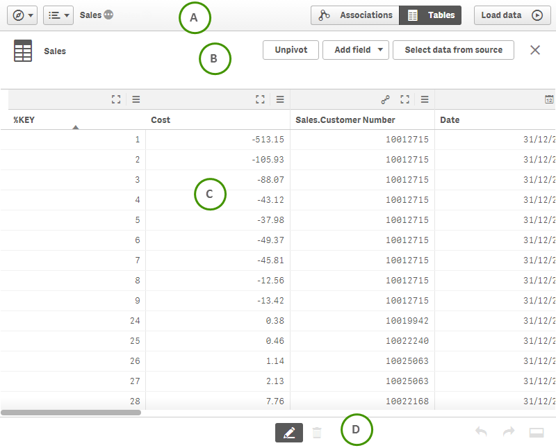 | B | All data tables in the app. You can add data from new or existing data sources, including Qlik DataMarket. You can also edit or remove existing data tables that were added with Data manager. | Adding data to the app | ||||||||||