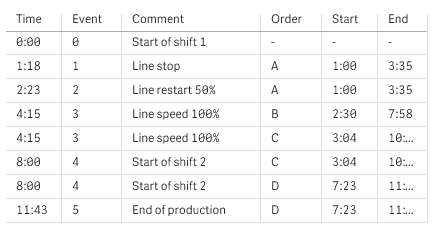 Look at the two tables below. The first table shows the start and end of production of different orders. The second table shows some discrete events. How can we associate the discrete events with the orders, so that we know, for example, which orders were affected by the disturbances and which orders were processed by which shifts?