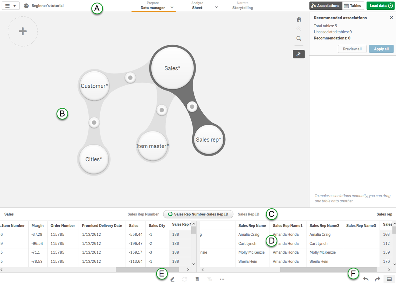 In the Associations view of the data manager your data is illustrated using bubbles, with each bubble representing a data table, and the size of the bubble representing the amount of data in the table. The links between the bubbles represent the associations between tables. If it's an association between two tables, you can select the button in the link to view or edit the association.
