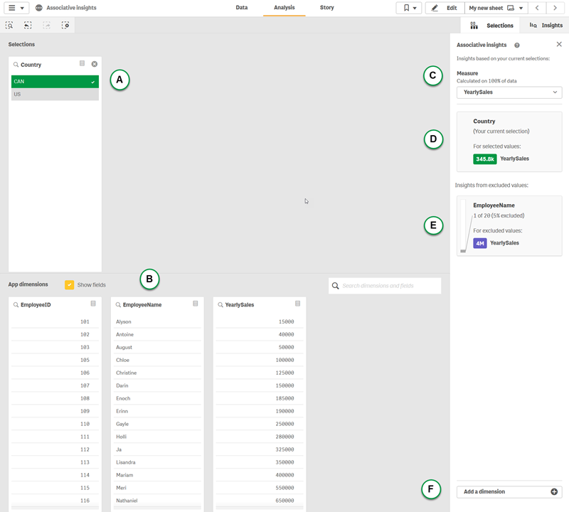When we click Generate insights, Qlik Sense selects interesting data to show in the associative insights cards. We see that CAN contributes 62.2% to our yearly sales. We also see in the bottom card that one of our employees (or 5% of all EmployeName) is excluded from this selection. This employee contributes 37.8% to our yearly sales. Purple indicates an insight.