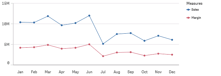 Using more than a few lines in a line chart makes the line chart cluttered and hard to interpret. For this reason, avoid using more than two or three measures.
