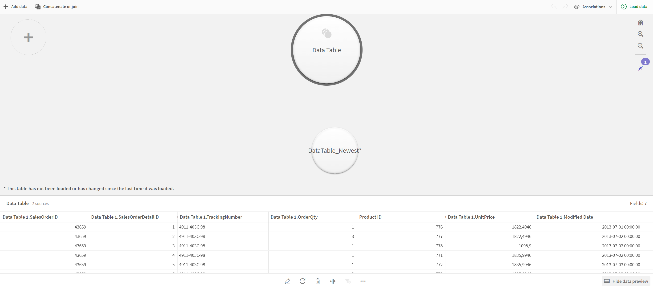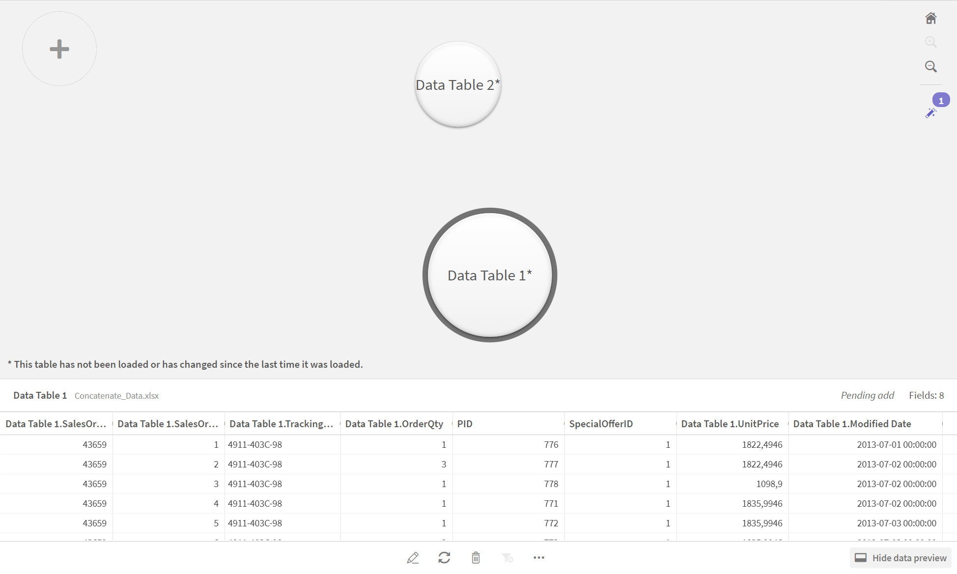 - Las tablas se concatenan automáticamente en el Gestor de datos cuando Qlik Sense detecta que una o más tablas añadidas tienen el mismo número de campos e idénticos nombres de campos que otra tabla. En este caso, puede dividir las tablas si es necesario.