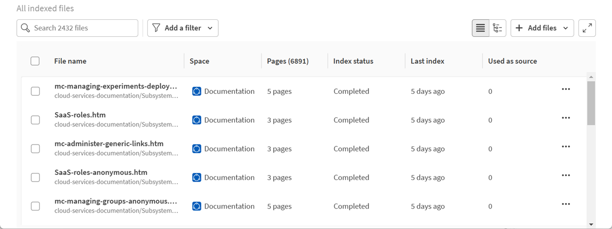 Dans la vue de fichier plat, vous pouvez voir tous les fichiers utilisés dans une base de connaissances. Dans la vue de fichier plat, vous pouvez gérer vos fichiers indexés. Pour plus d'informations, consultez Gestion des sources de données d'une base de connaissances.