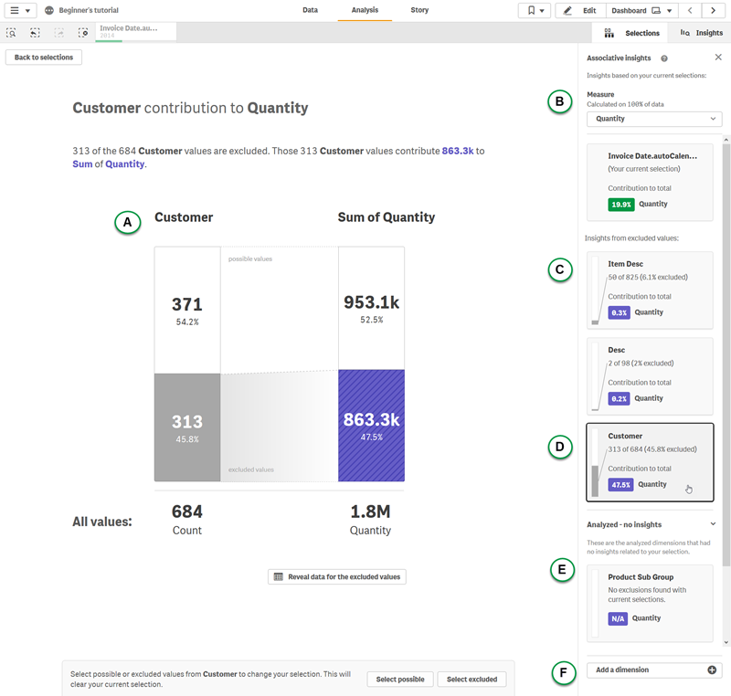 Associative insights reveals relationships in your data. The Qlik cognitive engine searches your data model for excluded values in a subset of fields. It then highlights those values, so you can explore them.