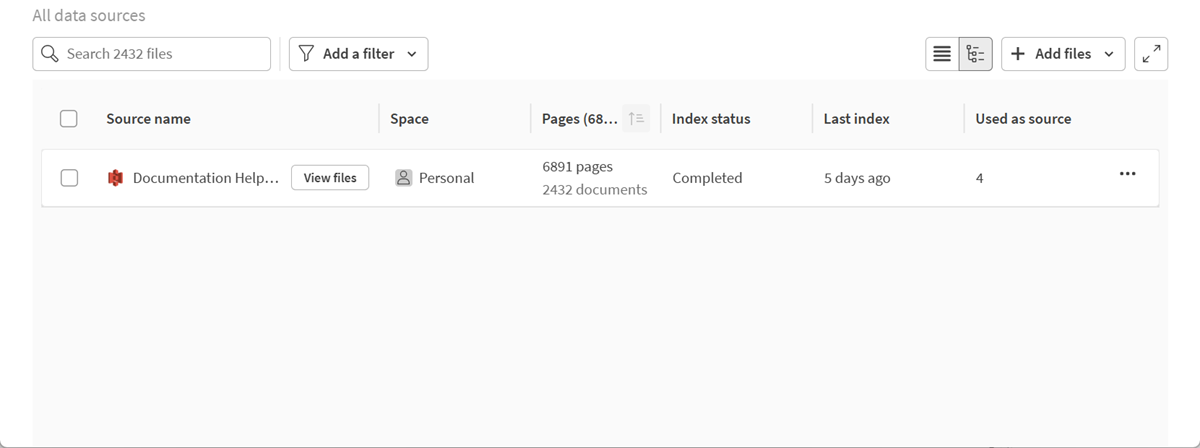 Nella vista piatta del file, è possibile vedere tutti i file utilizzati in una knowledge base. In tale vista piatta del file, è possibile gestire i file indicizzati. Per ulteriori informazioni, vedere Gestione delle sorgenti dati delle knowledge base.