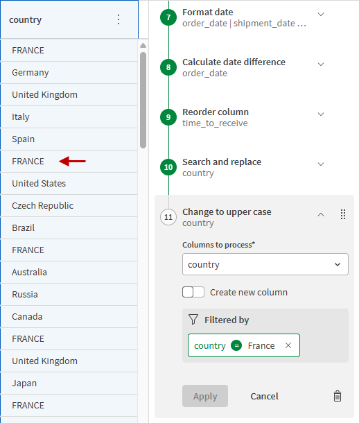 Tutte le righe sono ora visualizzate di nuovo, ma solo le occorrenze di Francia sono ora in maiuscolo.
