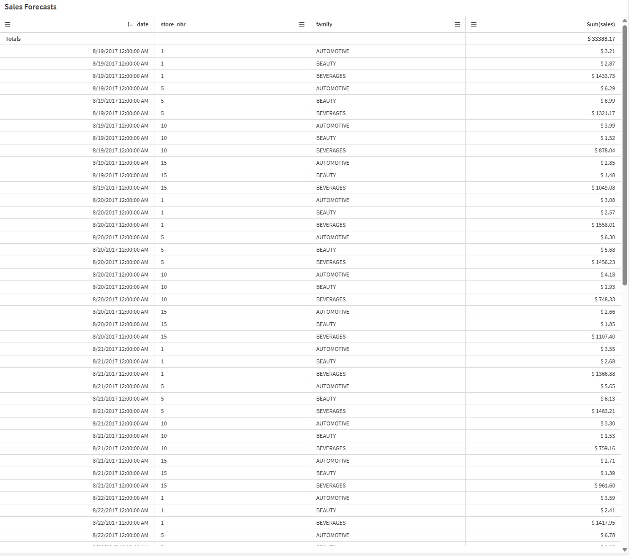 このテーブルには、過去データの終了日である 2017 年 8 月 15 日から 3 日後の予測が含まれている必要があります。テーブルには 7 つの固有の日付があり、Sum (sales) 列に予測が含まれている必要があります。