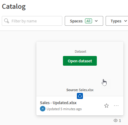 データセットの名前は、 [カタログ] (一般ビュー)、 [ホーム]、 [お気に入り]、 [コレクション]、 [データセット] ビュー、Qlik Cloud のその他の領域から編集できます。Qlik Cloud 内でファイルとしてアップロードされたデータセットの名前を編集すると、データ リソースのエイリアスが作成されます。データセットの名前を変更しても、基となるデータ ファイルの名前は変更されません。