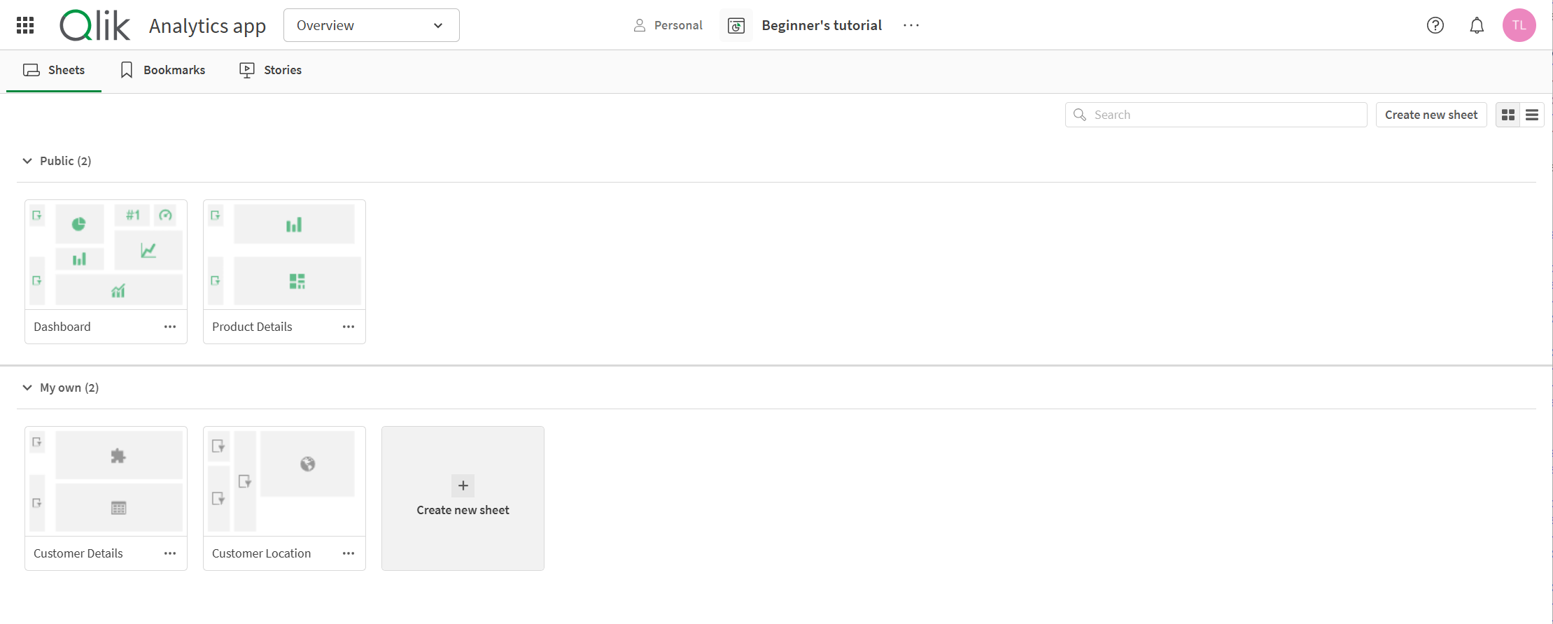 앱 개요에서 시트, 북마크 및 스토리를 관리합니다.