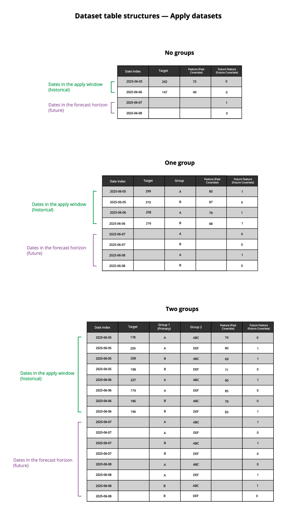 구체적으로, 날짜 인덱스는 시계열 문제의 훈련 및 적용 데이터 세트에 나타나는 열입니다. 날짜 인덱스는 이 두 적용 데이터 세트의 구조를 결정합니다—각 행은 시간의 한 단계를 나타냅니다(또는 그룹과 함께, 각 고유 그룹화에 대한 시간의 한 단계).