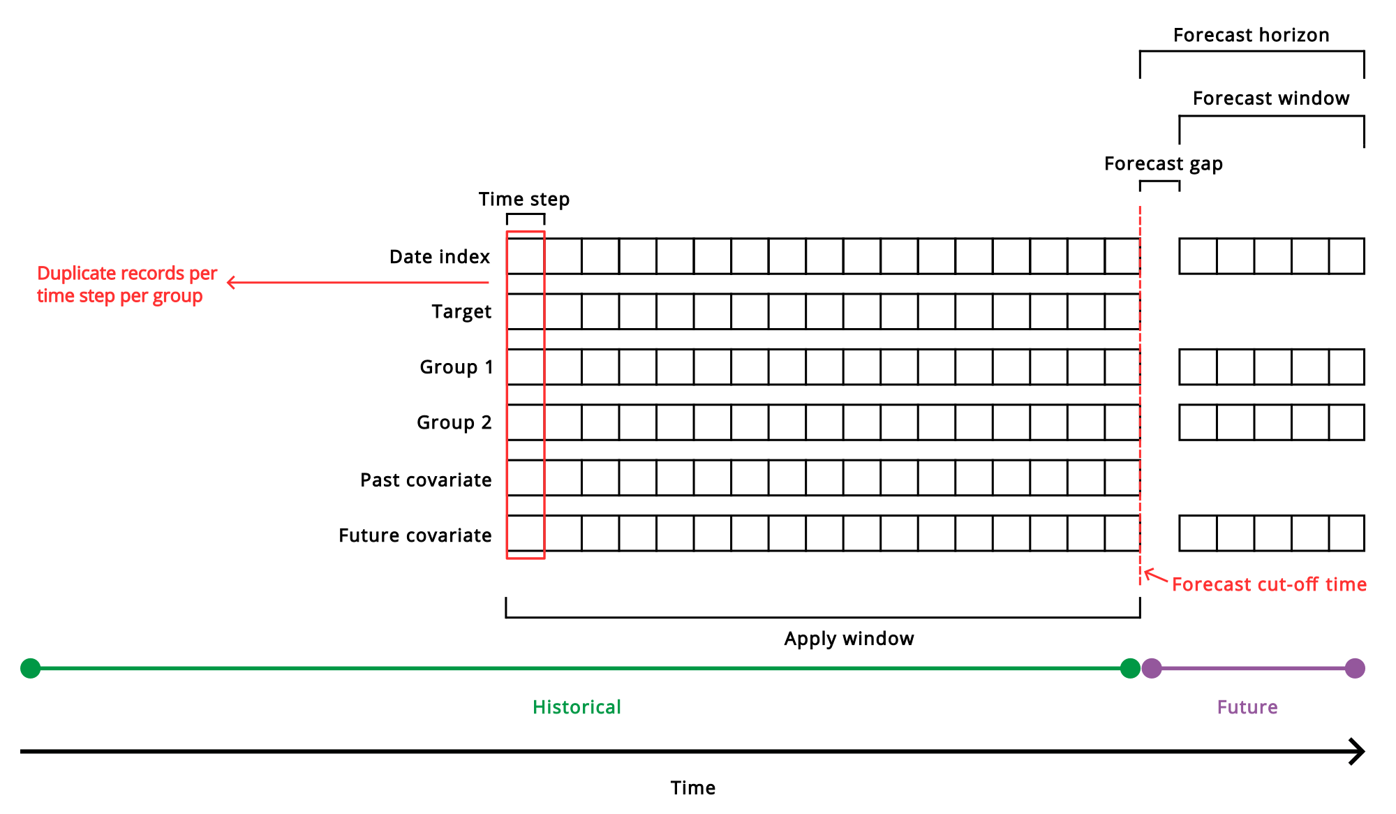 적용 기간은 사용자의 훈련 구성에서 자동으로 식별됩니다. 주어진 예측 기간에 대한 예측을 생성하려면 최소한 적용 기간을 포함하는 과거 데이터를 제공해야 합니다. 이는 적용 데이터세트에서 제공됩니다. 적용 데이터 집합 준비을 참조하십시오.