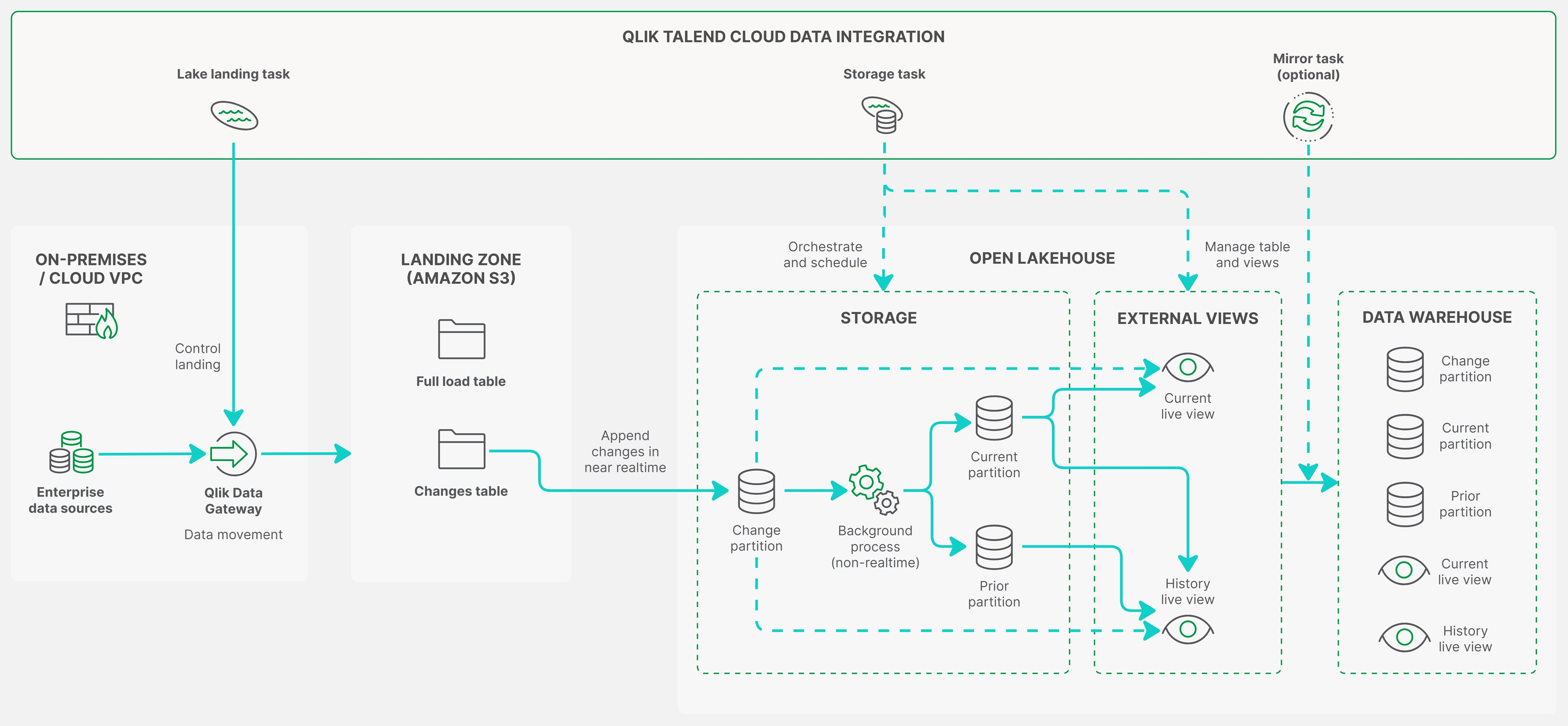 Qlik 오픈 레이크하우스에서 데이터 집합을 생성하면 저장소 테이블, 변경 테이블 및 뷰가 Qlik Talend Data Integration에 의해 자동으로 생성됩니다. 이러한 뷰를 쿼리하여 Iceberg 오픈 테이블 형식으로 저장된 현재 및 기록 데이터에 액세스할 수 있습니다.