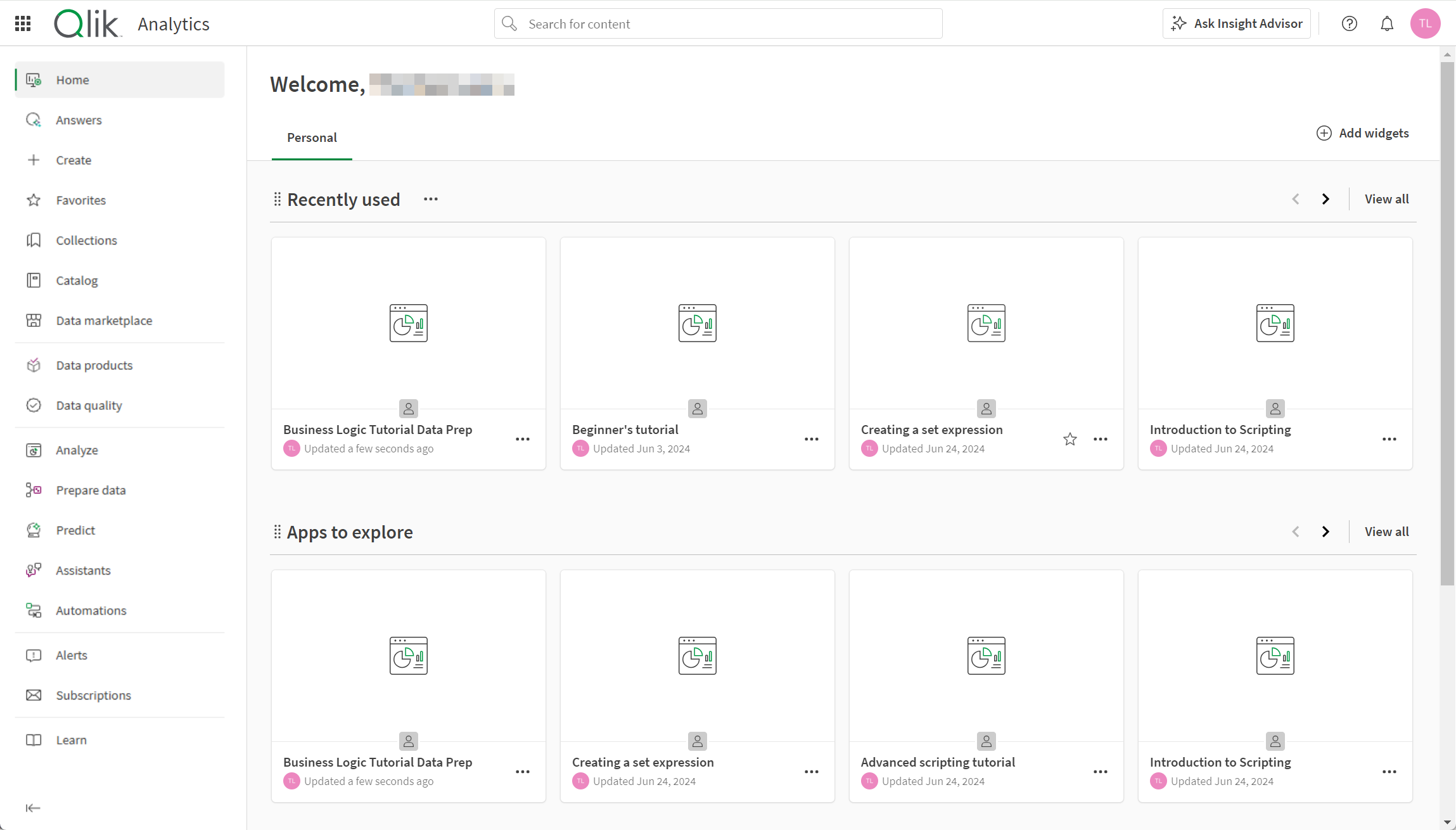 처음 로그인한 후 Qlik Cloud에 로그인하면 홈에서 시작하게 됩니다. 여기에서 앱, 스크립트, 차트, 메모 등 다양한 콘텐츠를 볼 수 있습니다. 어떤 콘텐츠 컬렉션이 홈에 나타날지 쉽게 사용자 지정할 수 있습니다.