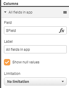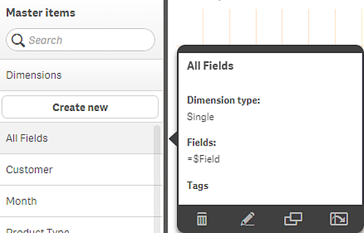 시각화에서 시스템 필드를 사용할 수 있습니다. 시스템 필드는 데이터 로드 스크립트 생성 시 Qlik Sense에 의해 만들어지며 로드된 데이터의 필드 및 테이블에 대한 정보를 포함합니다. 시스템 필드는 "$"로 시작하고, "$"를 포함하는 필드 이름을 수동으로 입력하여 참조해야 합니다. 시스템 필드를 사용하여 마스터 항목으로 차원을 만들거나 속성 패널에서 차원을 만들 수 있습니다.