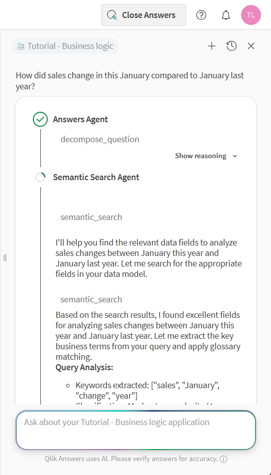 Voer uw vraag in en Qlik Answers genereert een antwoord. Qlik Answers gebruikt verschillende agents om antwoorden te genereren. U kunt klikken op Redenering weergeven om de redenering van elke agent te bekijken terwijl uw antwoord wordt gegenereerd.