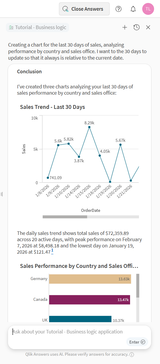 U kunt vragen om specifieke diagrammen of werkbladen. U kunt bijvoorbeeld vragen: Maak een diagram dat de verkoop van de afgelopen 30 dagen per land en verkoopkantoor toont. U kunt gedetailleerde instructies geven aan Qlik Answers. Als u een diagram wilde dat kijkt naar de verkoop van de afgelopen 30 dagen, ten opzichte van de huidige afgelopen 30 dagen, dan kunt u vragen: Maak een diagram voor de verkoop van de afgelopen 30 dagen, waarbij de prestaties per land en verkoopkantoor worden geanalyseerd. Ik wil dat de 30 dagen worden bijgewerkt, zodat deze altijd relatief zijn ten opzichte van de huidige datum.