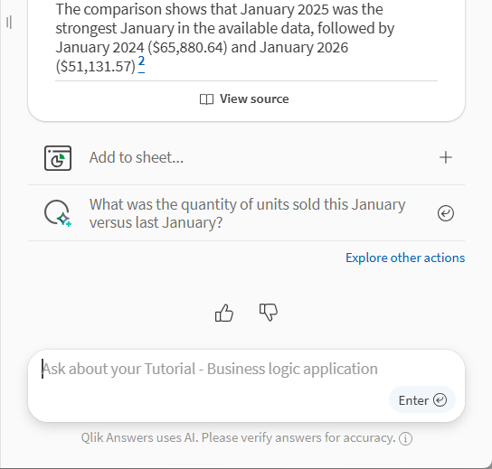 Klik onder het Qlik Answers antwoord op Toevoegen aan werkblad.