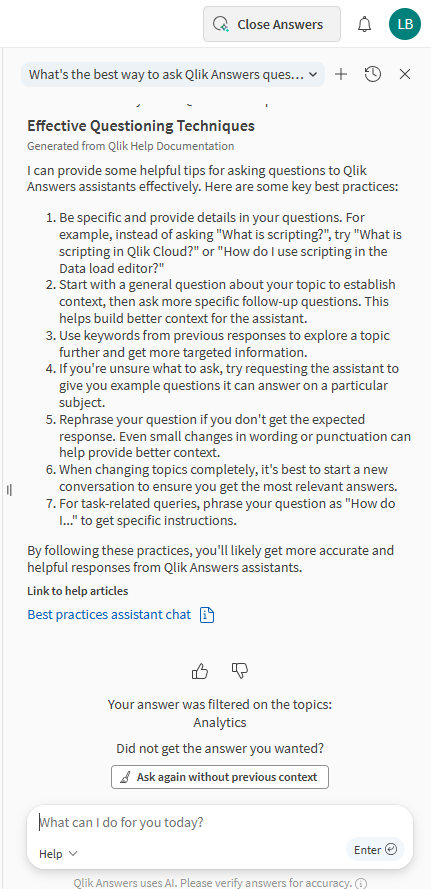Qlik Help is contextgevoelig; het filtert de helpinhoud op basis van het activiteitencentrum waarin u zich bevindt. Voor de beste resultaten, als u bijvoorbeeld een vraag wilt stellen over Analyse, moet u naar het Analyse activiteitencentrum gaan. Als het antwoord niet is wat u nodig hebt, kunt u onderaan het antwoord klikken op Opnieuw vragen zonder vorige context om Qlik Answers de vraag opnieuw te laten uitvoeren zonder de vorige context te gebruiken.