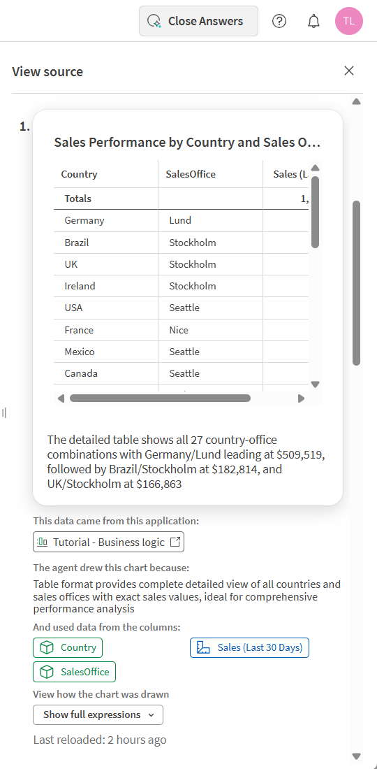 Terwijl u vragen stelt, worden antwoorden verwerkt door Qlik Answers agents om uw vragen te interpreteren en antwoorden op te bouwen met behulp van de beschikbare bronnen, waarbij wordt gezorgd dat de antwoorden relevant zijn voor uw behoeften. U kunt de gebruikte bronnen bekijken om de antwoorden op te stellen.