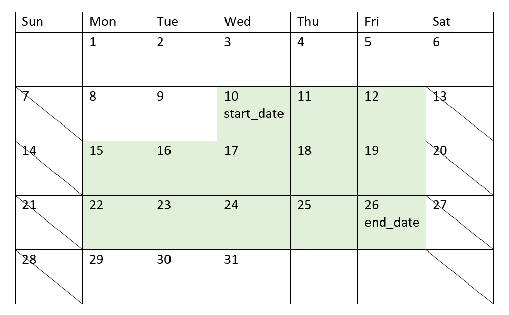 Como não há feriados programados (isso estaria presente no terceiro argumento da função networkdays()), a função também subtrai o start_date de end_date como todos os fins de semana, para calcular o número de dias úteis entre as duas datas.