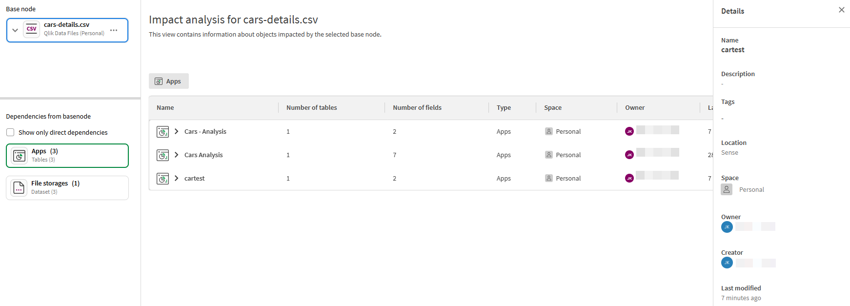Qlik Cloud предоставляет агрегированную сводку нисходящего воздействия, которая позволяет интерактивно исследовать прямые или косвенные зависимости данного поля или объекта.