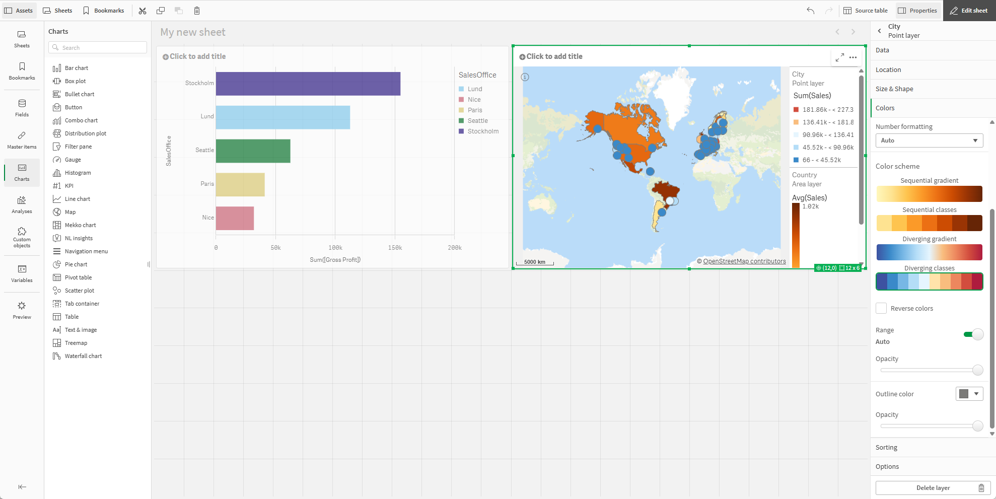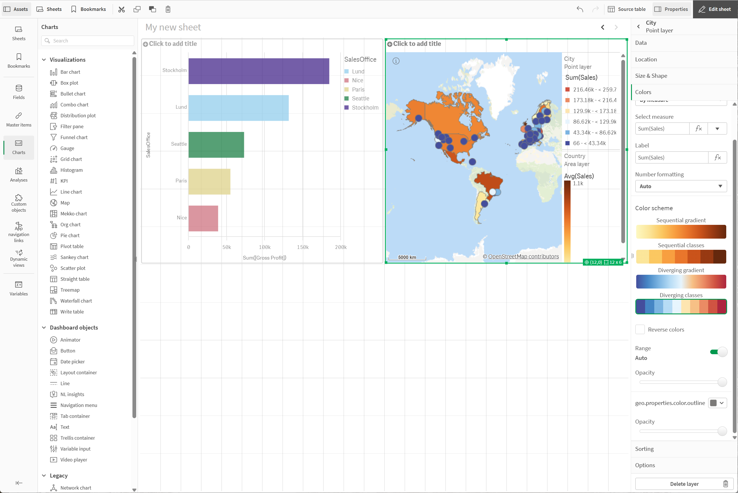В разделе Цвета выберите Пользовательский, щелкните По мере и раскрасьте по Sum(Sales).