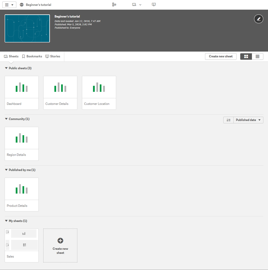 Public sheets / Public stories Sheets and stories that were included in the app when it was published or republished, or added to the public sheets and stories of the app after it was published. All users of the app have access to these.