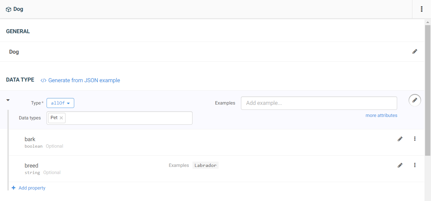 In diesem Beispiel enthält der Datentyp Dog (Hund) alle Eigenschaften des Datentyps Pet (Haustier) sowie einige spezifische Eigenschaften von Hunden.