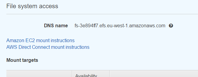 sudo mount -t nfs4 -o nfsvers=4.1,rsize=1048576,wsize=1048576,hard,timeo=600,retrans=2<put your DNS name here>:/ efs