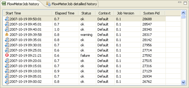 The History view gathers all execution instances of the Job which you selected on the Jobs view. The execution instances are ordered following their Start time and System PID. The latest execution instance is shown at the top of the list.