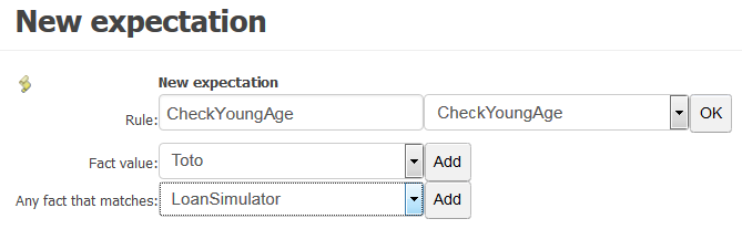 6. In the test editor, click Add a field under the new fact name, select age from the dialog box that opens. Click OK.